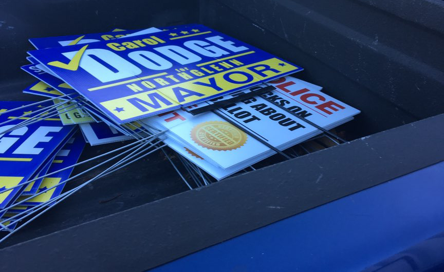 Oops! Sorry about that, Northglenn mayoral candidate Carol Dodge, but whoever is putting out your campaign’s official yard signs needs to be more discreet about…you know, those other signs! It’s been suggested to us that this is Wayne Dodge’s truck, Carol’s spouse and owner of Northglenn’s Dodge Sign Company on East 112th Avenue. We have no way of confirming that detail, but it’s fairly obvious that her campaign is involved.