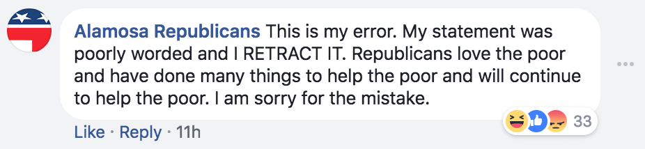 The Alamosa County Republican party posted on its Facebook page today, publicly stating that “Republicans hate poor people.”