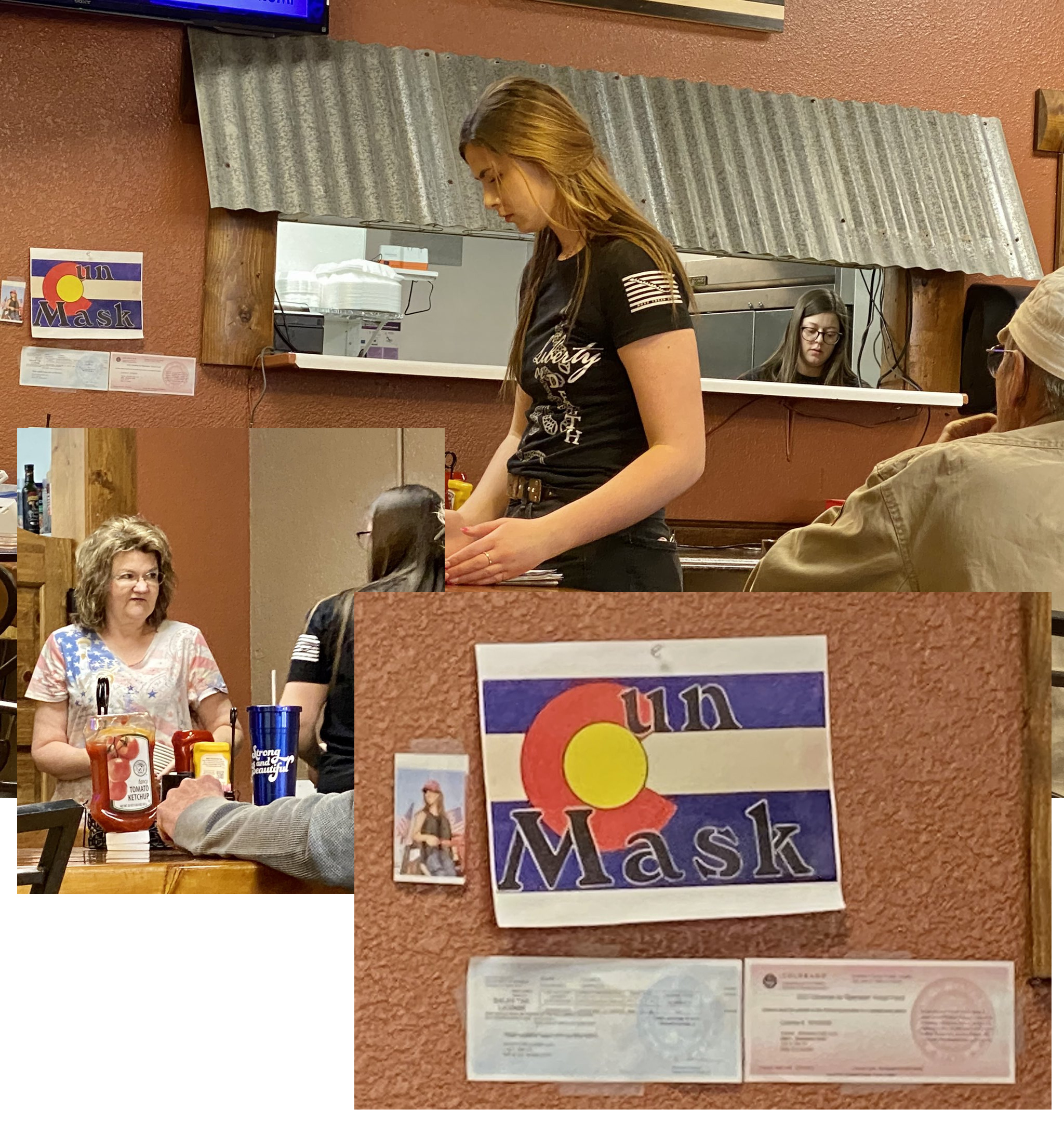 Not only are the employees not wearing masks, Shooters Grill is celebrating their anti-masker resistance on the wall next to their business license! Being an establishment that was shut down last May by court order after Boebert openly defied the Garfield County Health Department, you’d think they’d be maybe a little bit more contrite? It seems to us like this is the sort of repeat offense that should rightly incur a stiffer penalty.