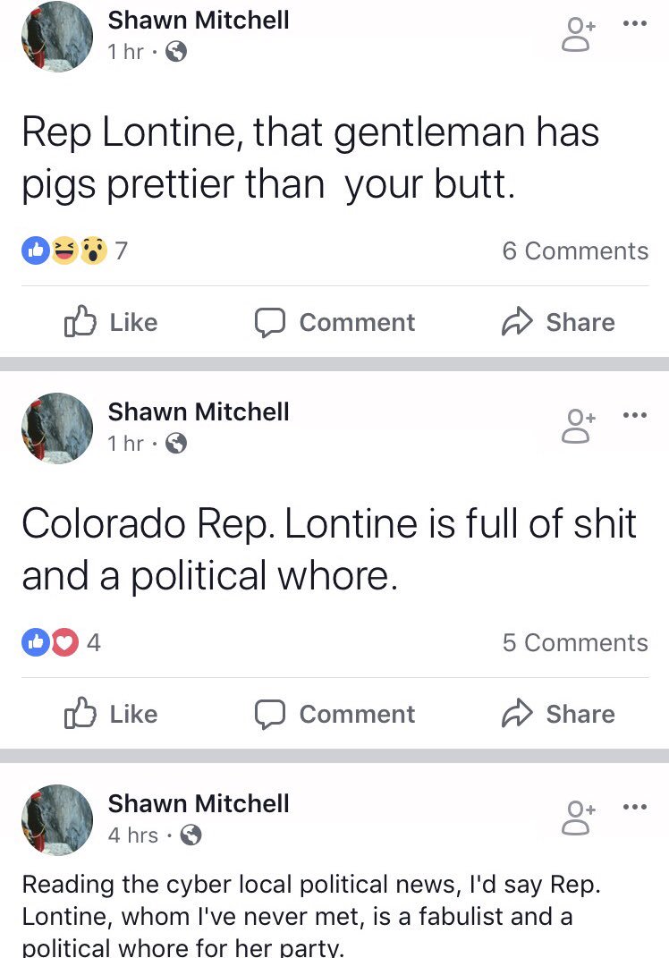 This latest case brings the number of Republican Senators implicated in the widening scandal over sexual harassment in the Colorado general Assembly to three–but this evening the story took on a far uglier dimension after former GOP Sen. Shawn Mitchell of Broomfield, who has reportedly never even met Rep. Sue Lontine, had what can be best described as a misogynist meltdown over her story on Facebook: