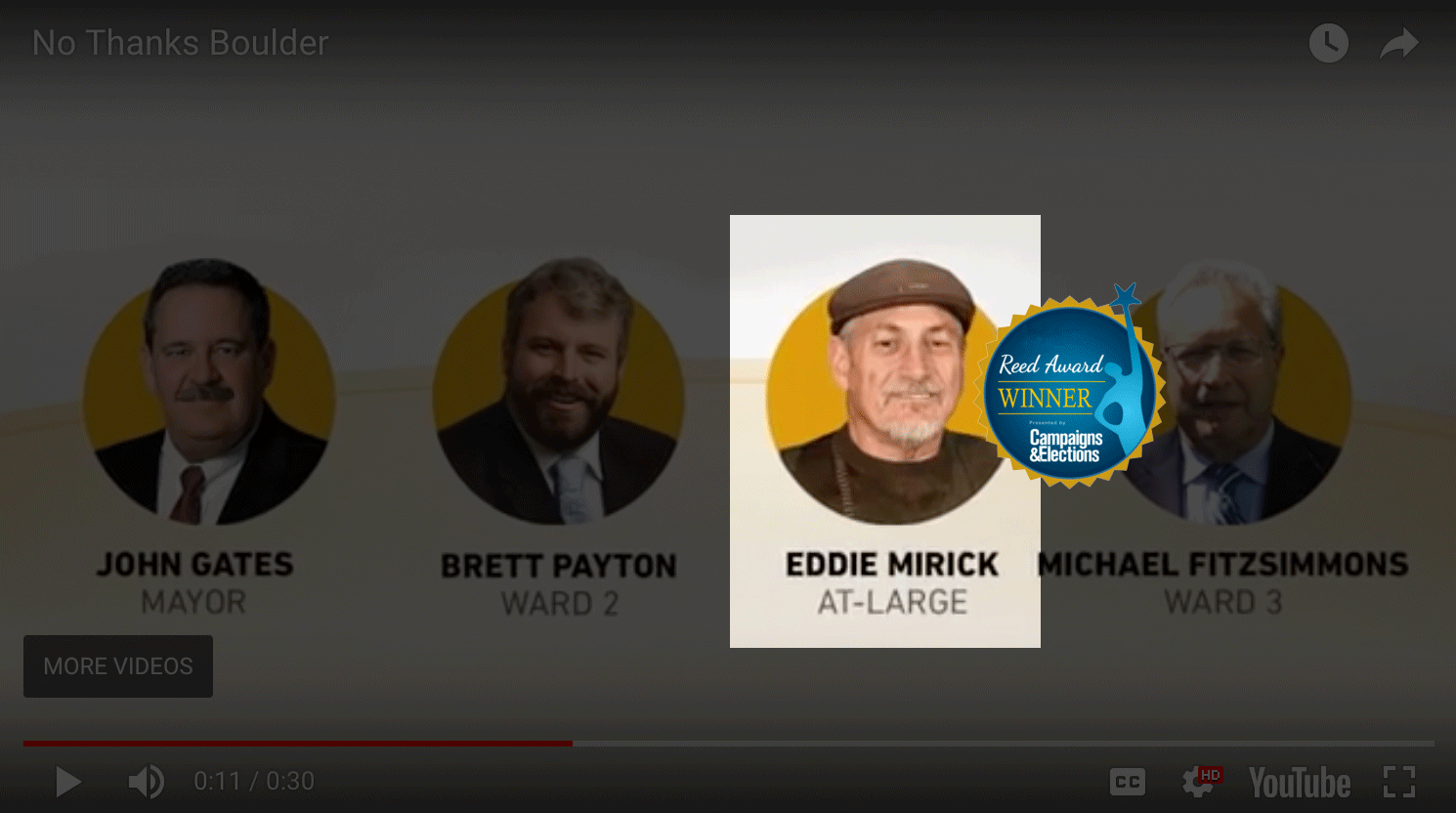 That’s right! Eddie Mirick, whom the above ad helped elect, was removed from office after his felony conviction was uncovered, violating the city charter, and the City Council seat was handed to his opponent–that is, the candidate this award-winning ad was attacking by proxy. That leaves us really uncertain what was so deserving of an honor in what amounts to a weird inside-baseball bank shot with an outcome that no one should be proud of.