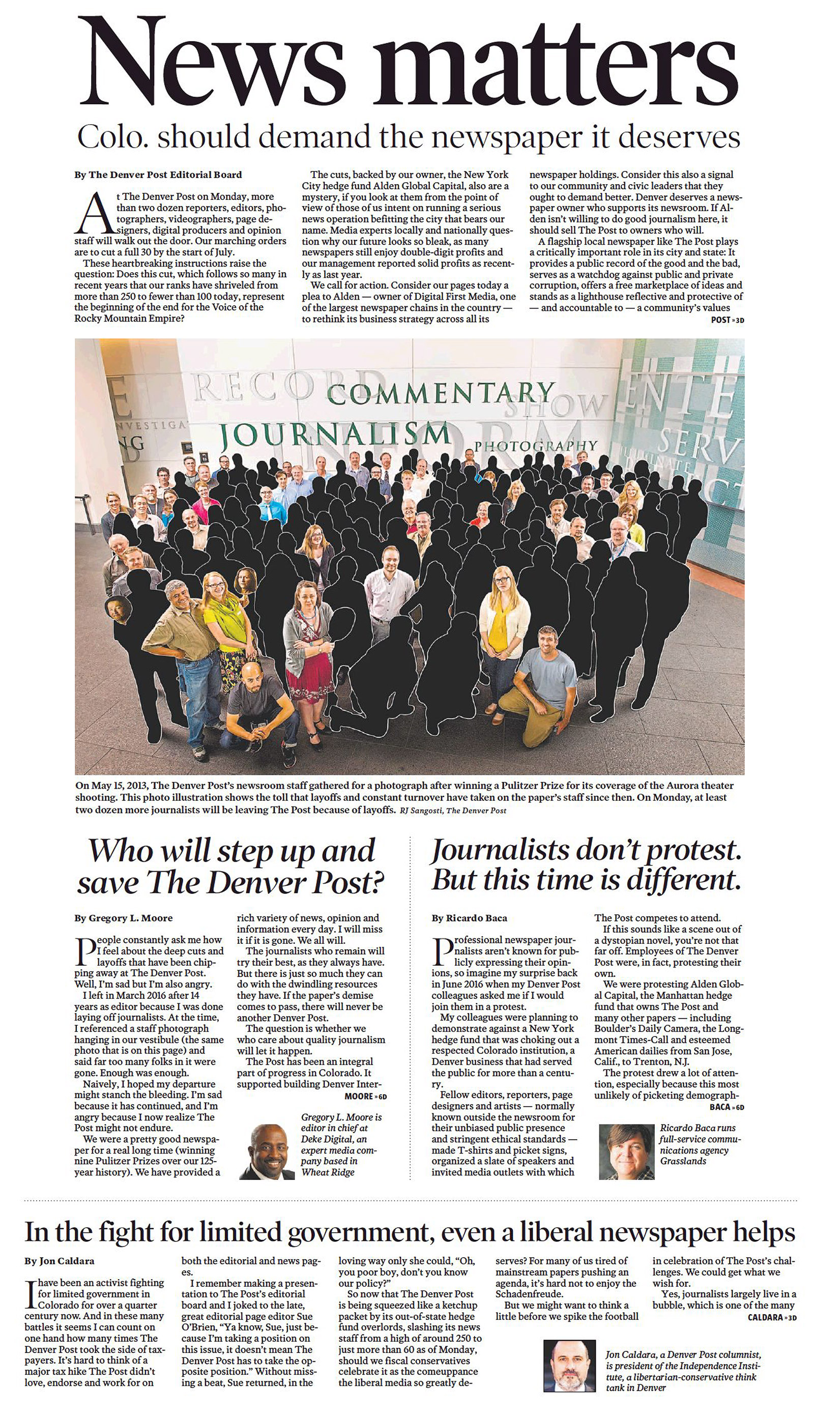 There’s plenty of discussion today about the unusual move by the Denver Post’s editorial staff to publicly attack the hedge fund owners of the paper, and some details like the choice of voices to defend the paper (see: Caldara, Jon) or the unsigned editorial’s disparagement of “both sides” of modern politics–we believe that an objective examination of media criticism on the left vs. right makes it clear that one side is actively undermining objectivity and critical thinking–have failed to resonate with audiences the paper definitely needs in their corner at this desperate hour.