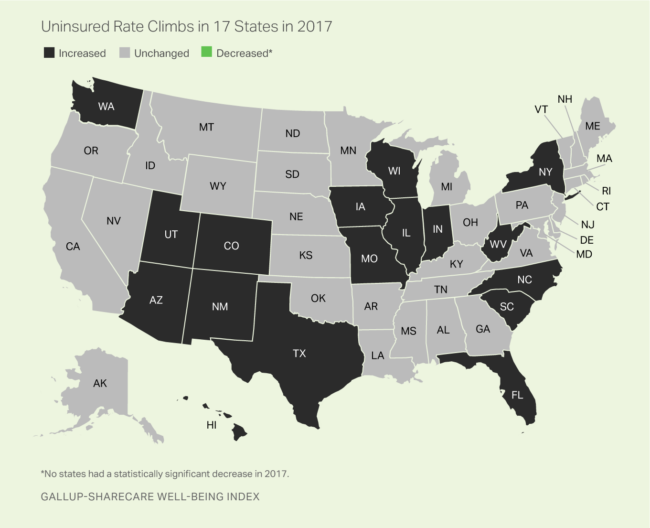 The uninsured rate rose by statistically significant margins in 17 states in 2017, the first time since the full implementation of the major mechanisms of the Affordable Care Act (ACA) in 2014 that any state had a rate increase. Also, for the first time since 2013, no states had a lower uninsured rate than the previous year. [Pols emphasis]…