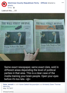 “Look at this….!!!” wrote the Montrose County (southern Colorado) Republican Party on its Facebook page, referring to a meme showing two editions of the Wall Street Journal with two different headlines about the same story.