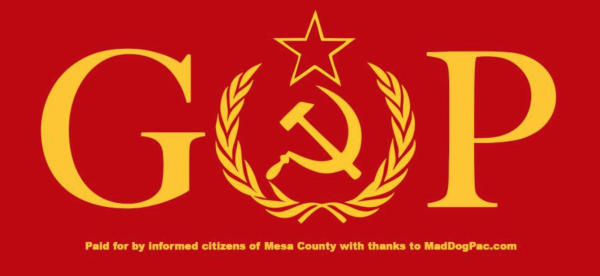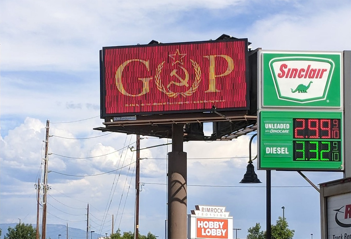 As the clock struck midnight last Sunday, Grand Junction night owls saw red–literally. The digital billboard looming over Rimrock Marketplace now displays a massive crimson and yellow “GOP,” but with the “O” replaced by the Russian hammer & sickle icon used by the former Soviet Union.
