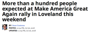 Saturday’s MAGA “rally” in Loveland stands in stark contrast to events like the “Women’s March” in Denver in January 2017 (and again in 2018), which drew hundreds of thousands of people to Civic Center Park. The MAGA rally won’t even come close to the crowd of thousands that attended the “March for Our Lives” rally in March 2018, or the “RedForEd” day in April.