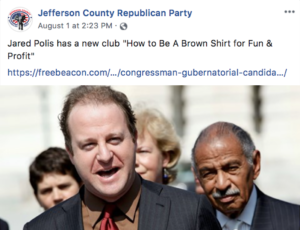 The Jefferson County Republican Party referred to Congressman Jared Polis as a “Brown Shirt” in an August 1 Facebook post. “Brown Shirt” is a nickname for a member of the Sturmabteilung, Hitler’s Nazi militia which beat and murdered those who opposed his rise to power. Polis, who is Jewish, is Colorado’s Democratic nominee for Governor.
