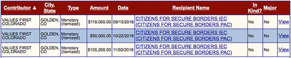 Here’s a screenshot of reported expenditures from the “Values First Colorado” caucus fund committee to the Independent Expenditure Committee “Citizens for Secure Borders:”