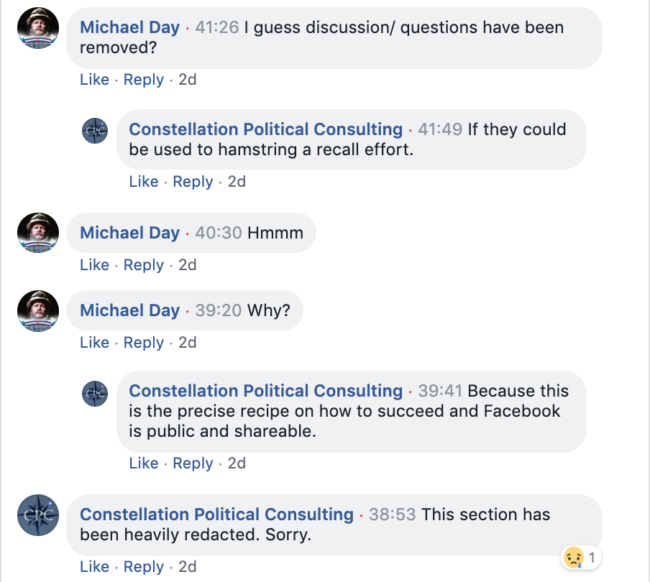 The video below was posted to Facebook by someone who attended a recall election training seminar on April 11 in Buena Vista, Colorado. The “recall training” is conducted by Ben Engen of Constellation Political Consulting, a Republican political consulting firm with clients that include the Colorado Republican Party and the GOP-led Senate Majority Fund. This is the full version of a video that was later redacted by Engen over concerns about what might happen if regular folks happened to get a glimpse behind the curtain. The frank discussion that takes place is almost unbelievable.