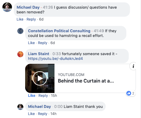 A few minutes later, Engen walks the audience through forming official committees in order to start raising money for their recall efforts. Take a look at how Engen responds to a question about whether these committees can accept donations from businesses: