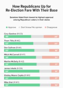 Sen. Cory Gardner (R-Colo.) is the least popular Republican with his home base, with 49 percent approving and 28 percent disapproving. But the man viewed widely as the most vulnerable incumbent seeking re-election next year has faced no talk of a serious primary challenger, as several Democrats are lining up for their party’s nod to compete for the seat. [Pols emphasis]