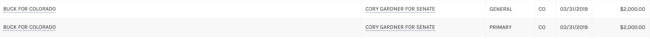 We heard rumors in March that Gardner went out of his way to demonstrate his support for Rep. Ken Buck as State Party Chairman in no small part because of concerns that Buck might be considering a Senate Primary in 2020. It’s probably no coincidence that Buck donated $4,000 to Gardner’s re-election campaign literally one day after being selected GOP Chair on March 30: