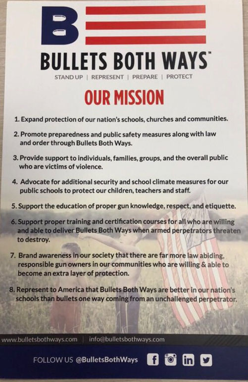 Neville’s “solution” to gun violence has been the same since he first joined the State House in 2105; he is a leader of the movement to get more guns in the hands of teachers. This is a sentiment shared by others in the “Rally For Our Rights” circle. Among the organizations on hand for Saturday’s “more guns” rally was a Colorado-based group called “Bullets Both Ways” that believes that “Bullets Both Ways are better in our nation’s schools than bullets one way coming from an unchallenged perpetrator.” This is asinine.