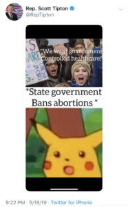The official Twitter account for Rep. Scott Tipton (R-Cortez) posted a rather disconcerting message on Saturday mocking women in regards to recent state decisions enacting stringent anti-abortion laws. As we noted on Sunday, the Tweet in question was deleted from Tipton’s account, but not before it was captured for posterity in a screenshot.