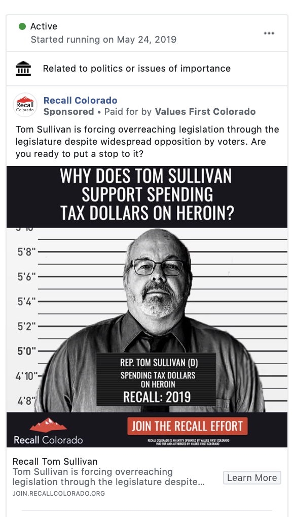 Here’s a Facebook ad that started running last Friday from Values First Colorado, the House GOP “independent” message group operated by House Minority Leader Patrick Neville’s family political consulting group Rearden Strategic: