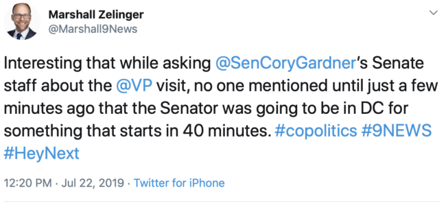 Joe St. George of Fox 31 conducted a very brief interview with Pence upon his arrival in Colorado today but was unable to get an answer to his question about why Pence wasn’t hosting any sort of public event for Gardner. Perhaps Cardboard Cory wasn’t available, either.