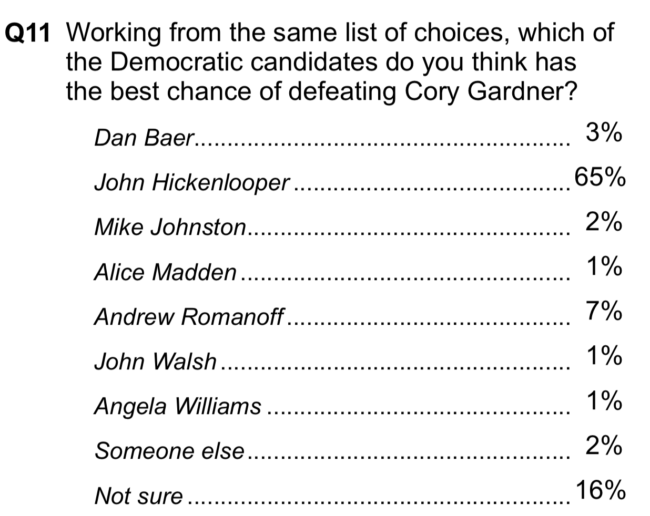 In this most recent poll, for example, 60% of respondents say they would support Hickenlooper’s candidacy and 65% say that Hick represents the Democrats’ best chance of defeating Gardner in 2020. Literally no other Democratic candidate makes it into double digits on either question.