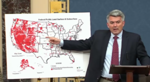 After a bunch of platitudes about the beauty of the West, Gardner gets to what has been his primary argument in support of moving the BLM offices: That public lands management will work better if the managers are closer to the public lands. Jabbing his finger at a red-colored map of the United States, Gardner said this: