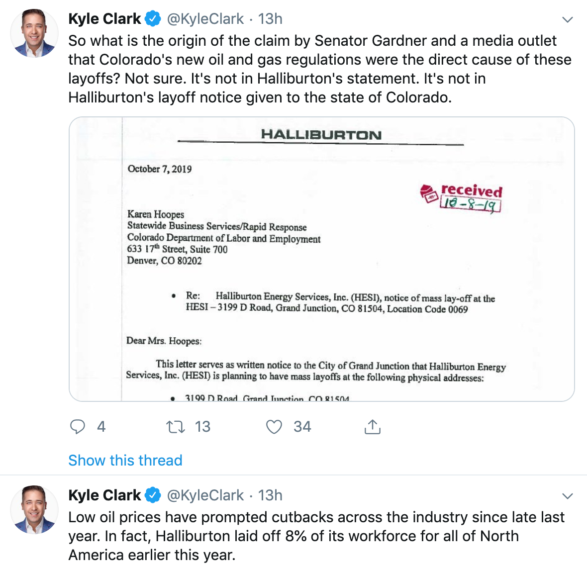 But more importantly, and just like Gov. Jared Polis told the audience at the COGA annual meeting this year to howls of rage and denial, the largest overriding factor determining the health of the oil and gas industry in Colorado is the global energy market. As Kyle Clark correctly states above, persistent low oil prices since a major crash at the end of 2018 are the reason for energy industry layoffs literally across the globe, including energy-producing regions across America. Regulation in Colorado has no measurable effect on the global price of energy, and all it takes is a moment to think this through before the entire factual basis of their argument falls apart.