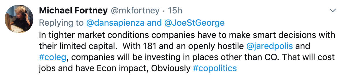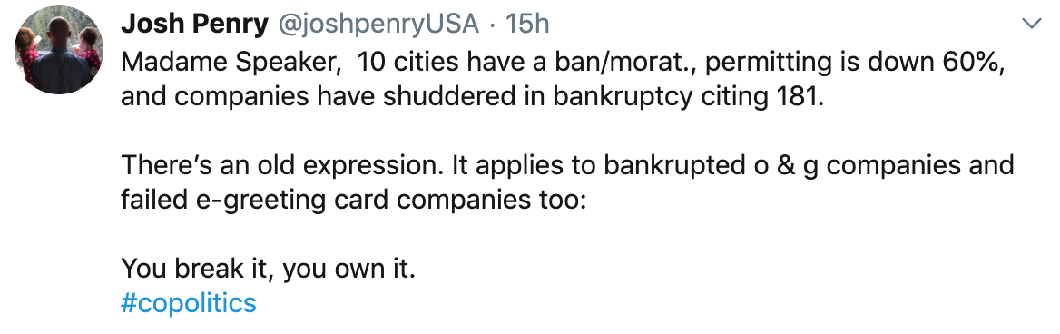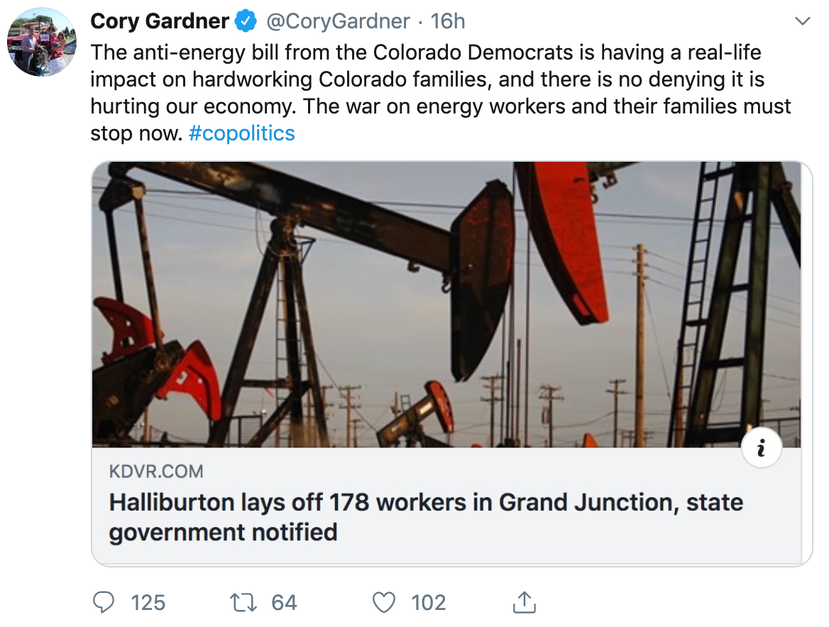 The last 24 hours have witnessed a remarkable turn of events that has played out mostly on social media, and resulted in considerable embarrassment for local Republicans and the fossil fuel energy industry PR people who they work closely with. The long battle this year over Senate Bill 19-181, landmark legislation reforming the mission of the Colorado Oil and Gas Conservation Commission that passed this year, has been a story of hyperbole and engineered backlash slowly giving way to the reality of a law that, while reforming regulatory oversight of oil and gas drilling to prioritize public safety over “fostering” more oil and gas drilling, does not represent anything like the disaster for the industry Republicans and industry flacks like the Colorado Oil and Gas Association warned it would be.