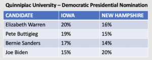 Last week we took note of a new poll from Quinnipiac University showing that the race for the Democratic Presidential nomination in Iowa appears to be centering on four candidates: Elizabeth Warren, Joe Biden, Bernie Sanders, and Pete Buttigieg. According to new polling results out today from Quinnipiac, the battle for New Hampshire looks much the same: