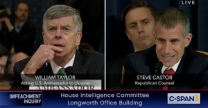 Of all the excuses, defenses, distractions and outright non sequiturs President Trump’s defenders deployed at Wednesday’s first public impeachment hearing — the whistleblower is biased! Hunter Biden is corrupt! Adam Schiff wanted nude photos of Trump! — the most telling came from Steve Castor, the Republicans’ chief counsel, as he questioned Bill Taylor, America’s man in Kyiv.