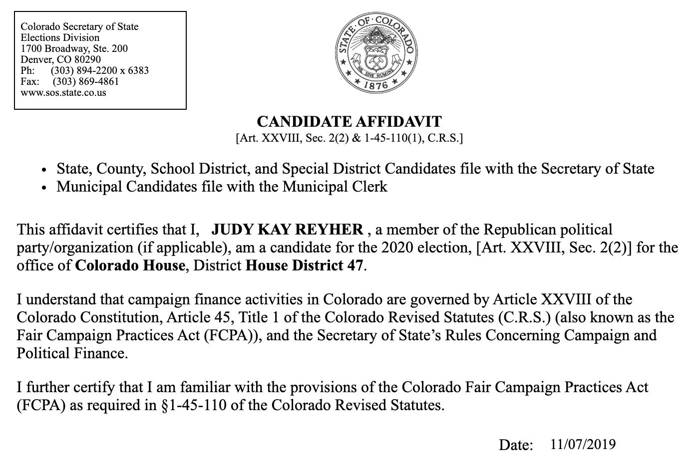 Readers will remember former Rep. Judy Reyher of House District 47, who was appointed to replace Clarice Navarro following Navarro’s patronage Trump administration appointment in return for campaigning as hard for Donald Trump in 2016 as she did for her own re-election. Rep. Reyher’s appointment to HD-47 quickly became a major embarrassment for the Colorado Republican Party after her extensive social media history of nasty-trending-wacky racist and other objectionable content was reported by statewide media. Responding to the Denver Post, Reyher attempted to defend herself by saying she “hated the black half of Obama as much as” she “hated the white half”–which to Reyher’s surprise did not make things better.