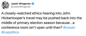 A hearing on the pending ethics complaint concerning former Gov. John Hickenlooper’s travel on private planes might not take place until after Democrats’ caucus to select candidates for the U.S. Senate race.