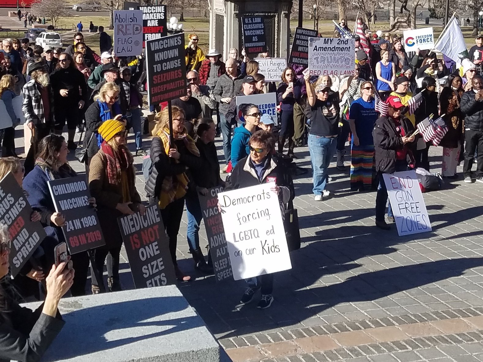 WEDNESDAY UPDATE: Via the Colorado Times Recorder, the Colorado Freedom Force Opening Day rally has begun at the state capitol with an estimated 200 protesters sounding off their color-coded conspiracies: