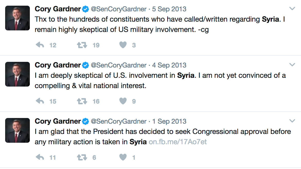 That’s the very same Cory Gardner, showing the world how “strong and united” the United States was in 2013–after an attack by Syrian government forces using nerve gas-tipped ballistic missiles against civilians near Damascus killed upwards of a thousand people. Gardner claimed that military action in response to this chemical weapons attack “without prior congressional authorization would violate the separation of powers that is clearly delineated in the Constitution.” This came after President Barack Obama told the Syrian government a year prior that use of chemical weapons would cross a “red line” obliging an American military response. Ultimately, despite Gardner’s (and the GOP-controlled Congress’) very public display of disunity a deal was brokered that resulted in the removal of most of Syria’s chemical weapons arsenal.