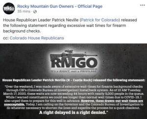 “While I warned constituents we could see longer than normal wait times to do COVID-19, I also urged [the state of Colorado] to prepare for this well in advance,” wrote Neville in his statement, which was distributed by Rocky Mountain Gun Owners, a hard-line pro-gun group.