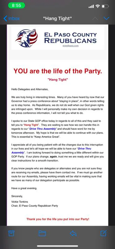 This week, El Paso Republicans distributed a document, titled “YOU are the life of the Party,” announcing that the event might be cancelled due to the stay-at-home order.