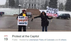 The second event starts at 2 p.m at the same location and is hosted by the Libertarian Party of Colorado. A Facebook page for this event shows 72 people going, 268 interested.