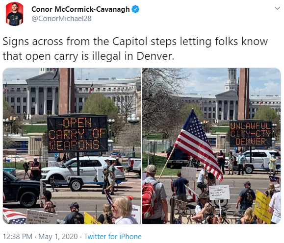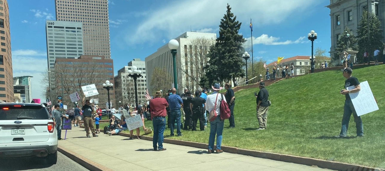 As readers know, the Colorado General Assembly is not currently in session, and it’s our understanding that lawmakers who might be working in the building today have been notified about the possibility of an illegal armed protest in the area. Last Sunday, a protester at a “Reopen Colorado” event who was openly carrying a pistol in violation of Denver gun laws was arrested while a large group of fellow protesters jeered police.