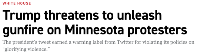 Critics immediately condemned Trump’s tweet, asserting that he was promoting violent retaliation against protesters, and Twitter took swift action. “This Tweet violated the Twitter Rules about glorifying violence,” read a gray box that now hides Trump’s tweet from public view unless a user clicks to see it. In doing so, Twitter also prevented other users from liking the president’s tweet or sharing it without appending comment.