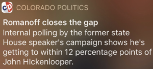 Andrew Romanoff’s campaign is touting (touting?) the results of an internal poll showing that it trails former Gov. John Hickenlooper by a 12-point margin. As Justin Wingerter of The Denver Post reports, Romanoff’s campaign is not “fully sharing” these poll results, but the former House Speaker’s campaign claims the numbers show that he is “gaining quickly” on Hickenlooper.