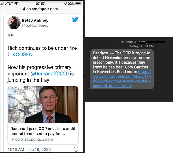 But whatever you read at Colorado Pols is because YOU came HERE to read it. We’ve received a few emails recently complaining about some anonymous text messages that either look like they came from ColoradoPols.com or contain a link to a Pols post. We haven’t sent anyone anything. If we were doing this, it wouldn’t make a lot of sense to be advocating for both Democratic U.S. Senate candidates, John Hickenlooper and Andrew Romanoff. Take a look at two examples we’ve been forwarded: