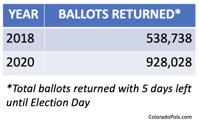 Take a look at a comparison of ballot returns today and with five days remaining until the Primary Election in 2018. We’re basing these comparisons on ballot return press releases issued by the Colorado Secretary of State’s office in 2018 (here) and 2020 (here).