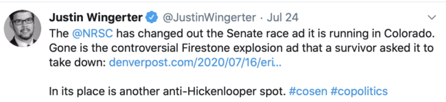 9News also confirmed that the NRSC was taking the ad off the air. At some point over the weekend, however, the NRSC decided to make ANOTHER change, putting the Firestone ad right back into its rotation in Colorado.
