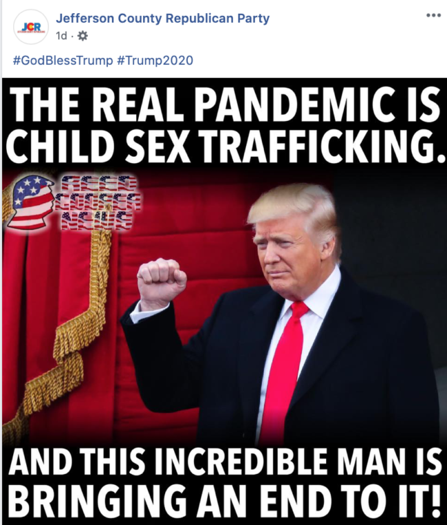 The currently raging QAnon unified field theory of crazy, which if you haven’t heard is a global cabal of wealthy elites to abduct children and variously abuse them sexually and/or obtain from their blood a wonder drug known as adrenochrome t0 stay forever young–look it up–has found a home in the Jefferson County, Colorado Republican Party: