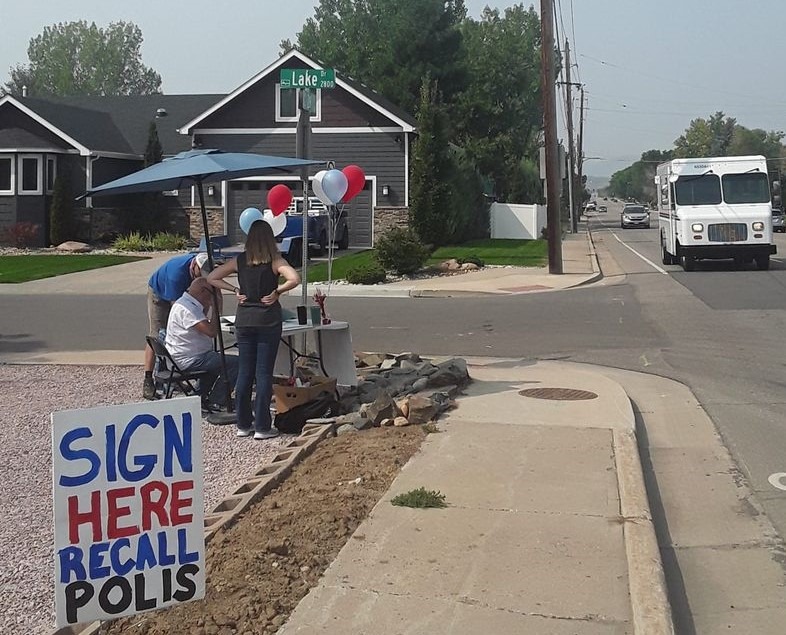 The first bonafide photograph of a place where Colorado voters can sign a petition to recall Gov. Jared Polis–not requiring a time machine back to 2019, mind you, the 2020 Recall Polis campaign–was sent to us today from a street corner in Loveland: