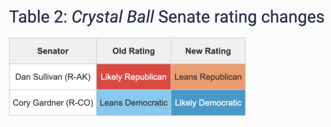Last week, the Crystal Ball downgraded the prospects of Sen. Susan Collins (R-ME) — we now rate the four-term Maine senator as an underdog against her Democratic challenger, state House Speaker Sara Gideon. Aside from Collins, the only Republican senator running in a Clinton state this year is Sen. Cory Gardner (R-CO). Colorado, at least in 2016, voted a couple of points more Democratic than Maine, and Gardner hasn’t had decades to cultivate a personal brand — as Collins has — so we’ve had his race at Leans Democratic since February.