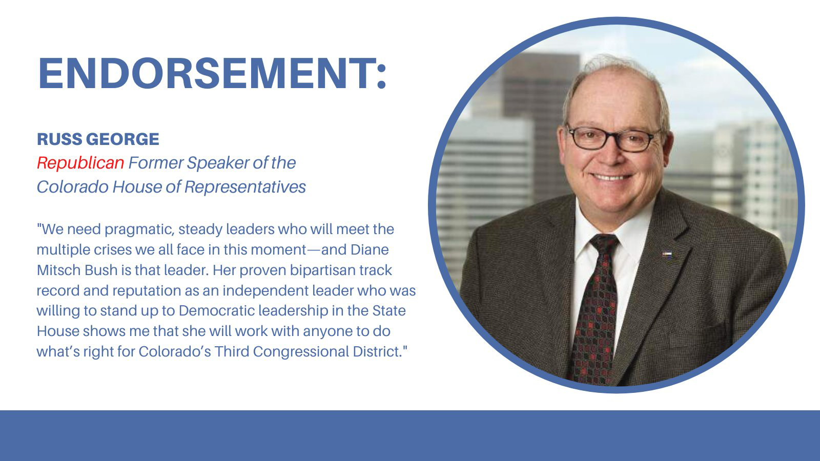Rifle Republican Russ George, a former speaker of the Colorado House of Representatives, on Thursday endorsed Diane Mitsch Bush, the Democratic nominee in the 3rd Congressional District.