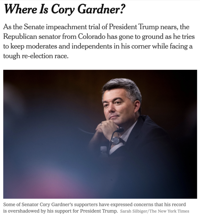 Gardner urges fellow Republican Senators to stand firm in refusing to call additional witnesses for the impeachment trial. Gardner gets skewered for lying about this to reporters. Greg Sargent of The Washington Post reports that Gardner knows full well that the Biden-Ukraine story is nonsense.