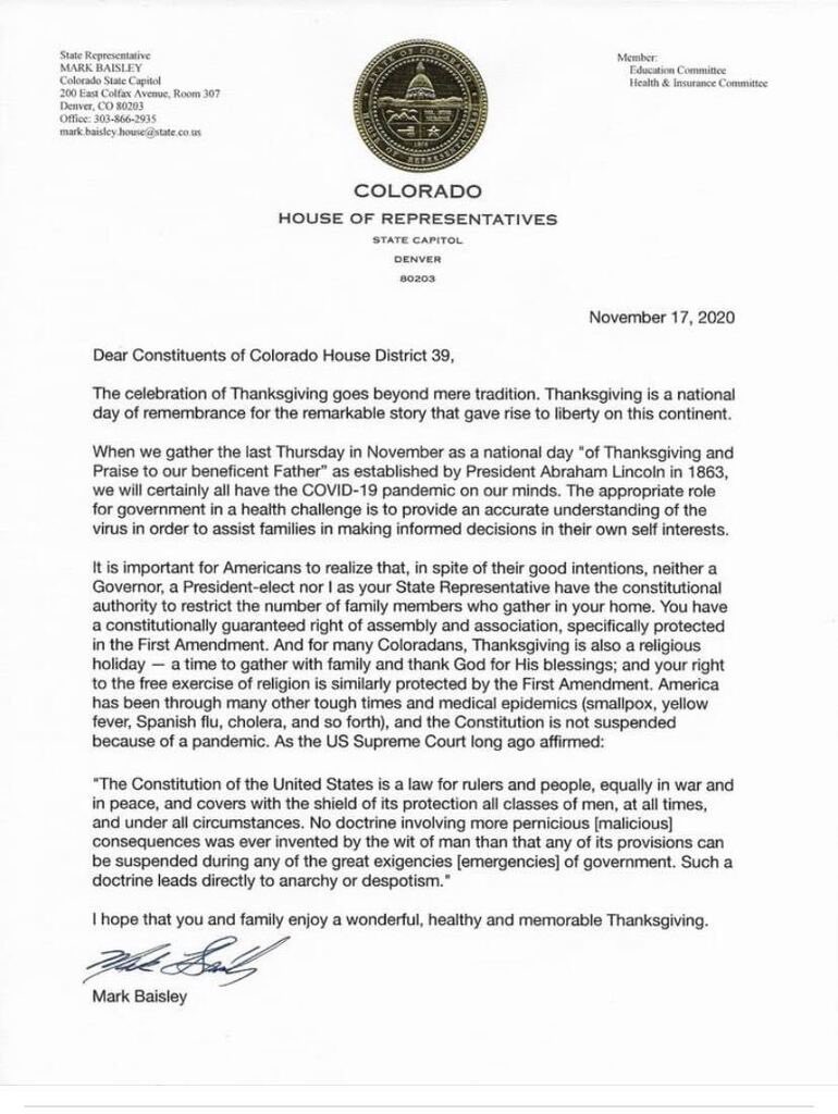 Rep. Baisley perfectly sums up the problem with the politicization of the COVID-19 pandemic in just these few paragraphs without realizing it. Yes, Americans have rights to freedom of assembly, and religious freedom. But Gov. Polis is not urging Coloradans to avoid mingling households over Thanksgiving in order to trample their freedoms. It’s about saving lives from a deadly disease that is spreading out of control. Just because one has a right to do a thing does not make it smart to do it wherever and whenever, and if a global pandemic that has killed 250,000 fellow Americans isn’t enough to convince someone to be serious about the safety of themselves and their families, we have no idea what could.