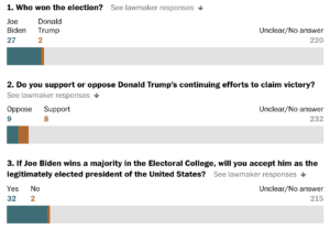 Nevertheless, The Washington Post devoted what we imagine was a considerable amount of time into surveying every Republican Member of Congress — all 249 of them — about the results of last month’s election. The Post mostly got a bunch of non-responses and was thus forced to research other public comments from Republicans. All told, only 27 GOP lawmakers acknowledged that Democrat Joe Biden is the President-elect. Two Republicans, Rep. Mo Brooks of Alabama and Rep. Paul Gosar of Arizona, actually maintain that Donald Trump won the 2020 election.