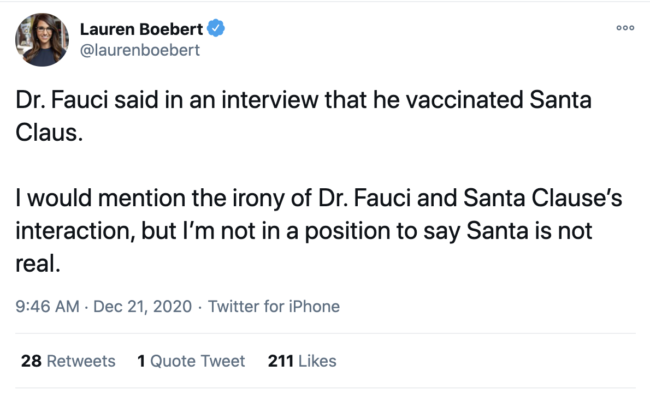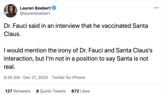 Our next reaction, of course, was about Boebert’s decision to out Santa Claus as a fictional character with Christmas Eve just three days away. Hopefully Boebert’s younger children don’t follow her on Twitter.