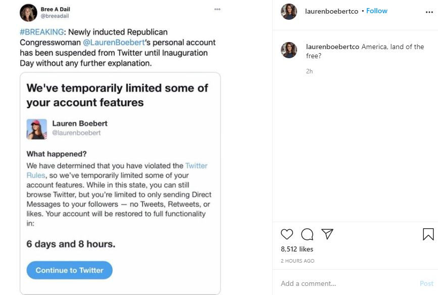 Rep. Lauren Boebert says Twitter has locked her account for nearly a week until the end of Inauguration Day…