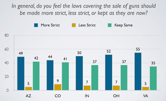 We received the toplines today for a new poll commissioned by Mayors Against Illegal Guns from Harstad Research, part of a multistate survey using local pollsters from both sides of the aisle. The survey dug into attitudes in Colorado on gun safety legislation–not surprisingly, the poll finds overwhelming opposition to handgun bans in Colorado, and some opposition to prohibiting the sale of high-capacity magazines for firearms. Interestingly, though, Coloradans surveyed in this poll overwhelmingly oppose loosening existing gun laws, such as allowing concealed weapons on college campuses (note to supporters of the “Pack Heat Anywhere Act”).