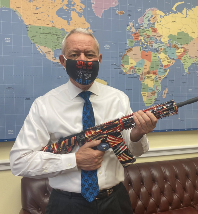 It’s another photo of Colorado Republican Party Chairman Rep. Ken Buck with his beloved boltless AR-15 at his Washington, D.C. office, but with a twist: this time wearing a face mask emblazoned with Rep. Lauren Boebert’s famous retort to Beto O’Rourke in September of 2019 in Aurora, arguably the moment that launched Boebert’s unlikely political career: “hell no, you’re not taking my AR-15.”